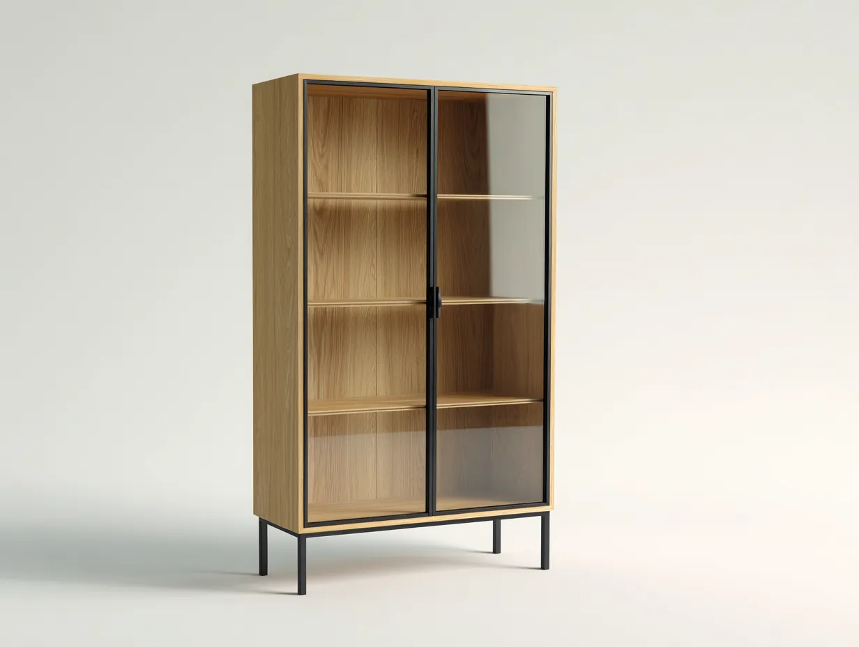 Struttura realizzata in legno con finitura naturale, abbinata ad ante e pannelli in vetro. I materiali sono selezionati per garantire stabilità, durata e una superficie facile da pulire nell'uso quotidiano.